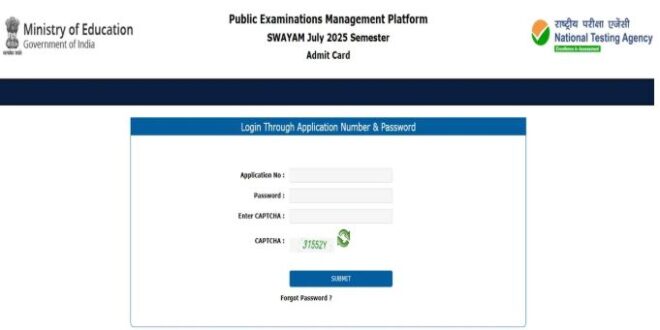 नेशनल टेस्टिंग एजेंसी (NTA) ने स्टडी वेब्स ऑफ एक्टिव लर्निंग फॉर यंग एस्पायरिंग माइंड्स (SWAYAM) जुलाई सेशन परीक्षा के लिए एडमिट कार्ड जारी कर दिए हैं। जो उम्मीदवार एनटीए स्वयं जुलाई सेशन की परीक्षा में शामिल होने वाले हैं और जिन्हें एडमिट कार्ड का बेसब्री से इंतजार था। अब वे ऑफिशियल वेबसाइट exams.nta.nic.in/swayam पर जाकर (NTA SWAYAM July Session 2025) परीक्षा के लिए एडमिट कार्ड डाउनलोड कर सकते हैं। एडमिट कार्ड डाउनलोड करने के लिए उम्मीदवारों को एप्लीकेशन नंबर, पावसवर्ड और कैप्चा कोड को दर्ज करना होगा।