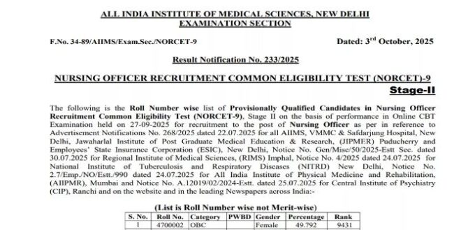 अखिल भारतीय आयुर्विज्ञान संस्थान (AIIMS) की ओर से नर्सिंग ऑफिसर रिक्रूटमेंट कॉमन एलिजिबलिटी टेस्ट (NORCET)-9 स्टेज-2 परीक्षा का रिजल्ट जारी कर दिया गया है। जो उम्मीदवार स्टेज-2 की परीक्षा में शामिल हुए थे और रिजल्ट का बेसब्री से इंतजार कर रहे थे अब वे आधिकारिक वेबसाइट पर जाकर स्टेज-2 परीक्षा का रिजल्ट देख व डाउनलोड कर सकते हैं। बता दें, स्टेज-2 परीक्षा का रिजल्ट पीडीएफ फॉर्मेट में जारी किया गया है।