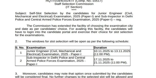 कर्मचारी चयन आयोग (SSC ) की ओर से जूनियर इंजीनियर, दिल्ली पुलिस और केंद्रीय सशस्त्र पुलिस बल में सब-इंस्पेक्टर परीक्षा की तैयारी करने वाले उम्मीदवारों के लिए एक बड़ी खुशखबरी है। दरअसल एसएससी की ओर से सीएचएसएल परीक्षा की तरह ही अभ्यर्थियों को अपनी सुविधानुसार परीक्षा शहर और परीक्षा तिथि का चयन करने का मौका दिया जा रहा है। जो उम्मीदवार इन परीक्षाओं में शामिल होने वाले हैं, वे एसएससी की आधिकारिक वेबसाइट पर जाकर SSC CPO SI 2025 के लिए सेल्फ स्लॉट बुकिंग कर सकेंगे। बता दें, सेल्फ स्लॉट बुकिंग 17 नवंबर से शुरू हो जाएगी।
