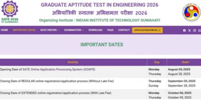 इंडियन इंस्टीट्यूट ऑफ टेक्नोलॉजी (IIT) गुवाहाटी की ओर से ग्रेजुएट एप्टीट्यूड टेस्ट इन इंजीनियरिंग (GATE) 2026 के लिए पंजीकरण प्रक्रिया कल यानी 28 सितंबर 2025 को समाप्त हो रही है। इच्छुक और पात्र उम्मीदवार आधिकारिक वेबसाइट gate.iitg.ac.in पर जाकर बिना लेट फीस के आवेदन जमा कर सकते हैं।