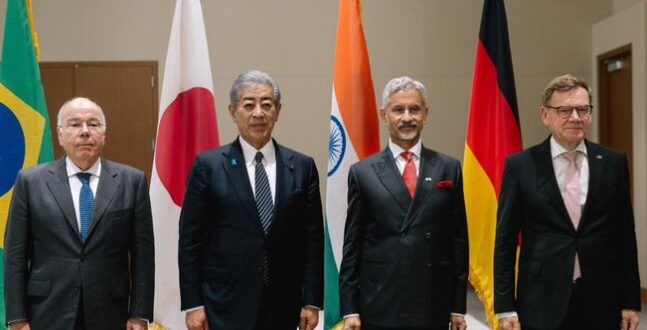 भारत, ब्राजील, जर्मनी और जापान के विदेश मंत्रियों ने संयुक्त राष्ट्र महासभा (यूएनजीए) के 80वें सत्र के दौरान मुलाकात कर संयुक्त राष्ट्र सुरक्षा परिषद (यूएनएससी) में सुधार की तत्काल जरूरत पर जोर दिया। इस बैठक में भारत के विदेश मंत्री डॉ. एस. जयशंकर, ब्राजील के विदेश मंत्री माउरो विएरा, जर्मनी के फेडरल विदेश मंत्री डॉ. जोहान वेडफुल और जापान के विदेश मंत्री इवाया ताकेशी शामिल हुए।