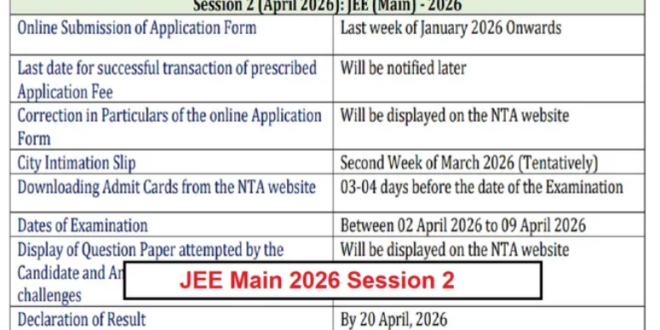 जेईई मेन सेशन 2 में आवेदन करने वाले उम्मीदवारों के लिए परीक्षा का आयोजन 2 से 9 अप्रैल 2026 तक करवाया जायेगा। एग्जाम के लिए एग्जाम सिटी स्लिप परीक्षा तिथि से 10 दिन पूर्व एवं एडमिट कार्ड 3 से 4 दिन पूर्व जारी होंगे। परीक्षा संपन्न होने के बाद रिजल्ट 20 अप्रैल 2026 को घोषित कर दिया जायेगा।