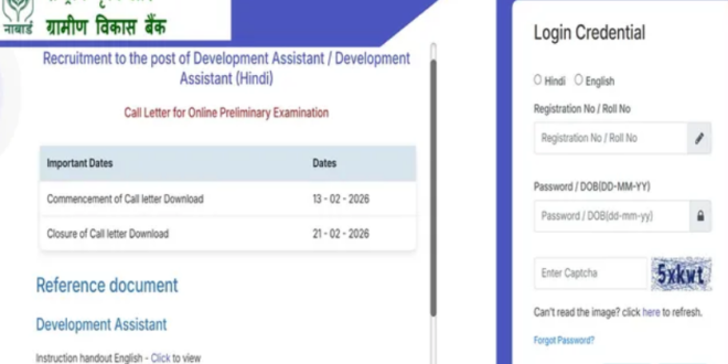 नाबार्ड की ओर से डेवलपमेंट असिस्टेंट प्रीलिम एग्जाम का आयोजन निर्धारित परीक्षा केंद्रों पर 21 फरवरी 2026 को करवाया जायेगा। एग्जाम के लिए एडमिट कार्ड का लिंक 21 फरवरी तक एक्टिवेट रहेगा। ध्यान रखें कि एग्जाम में शामिल होने के लिए उम्मीदवार प्रवेश पत्र अनिवार्य रूप से डाउनलोड कर लें।
