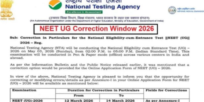 राष्ट्रीय पात्रता सह प्रवेश परीक्षा- स्नातक (NEET UG Form 2026) एग्जाम के लिए एप्लीकेशन फॉर्म 8 फरवरी से लेकर 11 मार्च तक भरे गए। लाखों अभ्यर्थियों ने इस एग्जाम में भाग लेने के लिए आवेदन किया है। नेशनल टेस्टिंग एजेंसी की ओर से आवेदन प्रक्रिया संपन्न होने के बाद NEET Correction Window ओपन की गई है जो आज 14 मार्च 2026 रात्रि 11 बजकर 50 मिनट तक ओपन रहेगी।