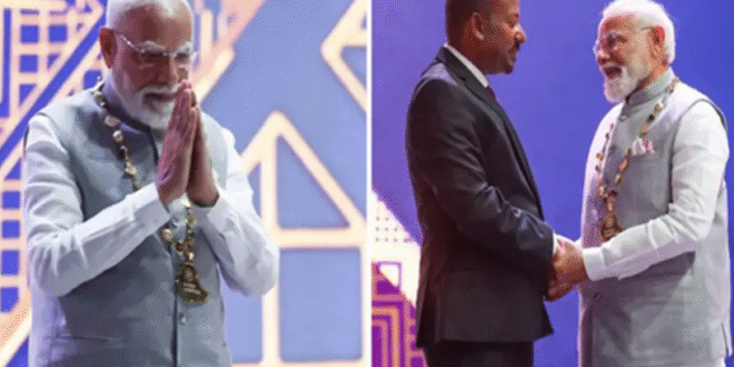 प्रधानमंत्री नरेन्द्र मोदी को मंगलवार को इथियोपिया के प्रधानमंत्री अबीअहमद अली ने अपने देश के सर्वोच्च नागरिक सम्मान ‘द ग्रेट ऑनर निशान ऑफ इथियोपिया’ से सम्मानित किया। यह पुरस्कार अदीसअबाबा में अंतरराष्ट्रीय सम्मेलन केंद्र में आयोजित एक विशेष समारोह में प्रधानमंत्री मोदी को प्रदान किया गया।