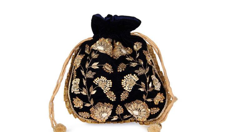 डोरी वाला यह पोटली बैग आपको शादी में एथनिक टच देगा। यह बैग फ्लोरल थ्रेड एम्ब्रॉयडरी से बना होता है। आप अपनी ड्रेस के कंट्रास्ट कलर में पोटली बैग ले सकती हैं।