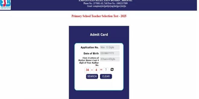 मध्य प्रदेश कर्मचारी चयन बोर्ड (MPESB) की ओर से प्राइमरी स्कूल टीचर (PSTST) परीक्षा का एडमिट कार्ड जारी कर दिया गया है। जो उम्मीदवार MPESB PSTST 2025 की परीक्षा में शामिल होने के लिए एडमिट कार्ड का बेसब्री से इंतजार कर रहे थे, वे अब आधिकारिक वेबसाइट esb.mp.gov.in पर जाकर तुरंत अपना एडमिट कार्ड डाउनलोड कर सकते हैं। उम्मीदवारों को एडमिट कार्ड डाउनलोड करने के लिए एप्लीकेशन नबंर, जन्मतिथि और कैप्चा कोड को दर्ज करना होगा।