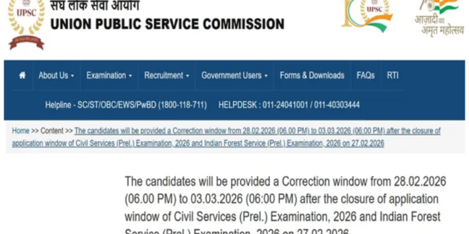 यूनियन पब्लिक सर्विस कमीशन (UPSC) की ओर से सिविल सर्विसेज एग्जाम (UPSC CSE 2026) के लिए करेक्शन विंडो ओपन कर दी गई है। जिन उम्मीदवारों से यूपीएससी आईएएस फॉर्म भरने में गलती हो गई है वे 3 मार्च 2026 तक ऑनलाइन माध्यम से एप्लीकेशन फॉर्म में सुधार कर सकते हैं। फॉर्म में करेक्शन ऑनलाइन माध्यम से पोर्टल upsconline.nic.in पर जाकर किया जा सकता है।