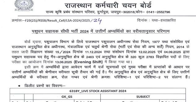 राजस्थान पशुधन सहायक परीक्षा का रिजल्ट जारी