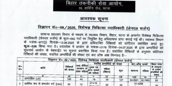 बिहार तकनीकी सेवा आयोग (BTSC) की ओर से विशेषज्ञ चिकित्सा पदाधिकारी परीक्षा का फाइनल रिजल्ट जारी कर दिया गया है। जो उम्मीदवार इस परीक्षा में शामिल हुए थे। अब वे अपना रिजल्ट देख सकते हैं। रिजल्ट बीटीएससी की ऑफिशियल वेबसाइट पर btsc.bihar.gov.in पर डाउनलोड करने के लिए उपलब्ध है। बता दें, बीटीएससी की ओर से रिजल्ट पीडीएफ फॉर्मेट में जारी किया गया है। साथ ही परीक्षा का आयोजन 26 अप्रैल, 2025 को किया गया था।