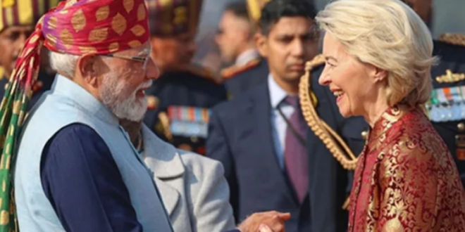 मुख्य अतिथि के रूप में यूरोपीय संघ (ईयू) की प्रमुख उर्सुला ने सोमवार को 77वें गणतंत्र दिवस समारोह में एक गहरे लाल और सुनहरे रेशमी ब्रोकेड का बंद गले का जैकेट पहना था। जब वह राष्ट्रपति द्रौपदी मुर्मु के साथ बग्गी से उतरीं, तो उनकी पोशाक पर फूलों के जाल वाली जरी की डिजाइन सुनहरी धूप में हल्की चमक बिखेर रही थी।