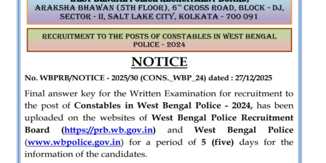 वेस्ट बंगाल पुलिस कॉन्स्टेबल फाइनल आसंर-की जारी, रिजल्ट जल्द आने की उम्मीद