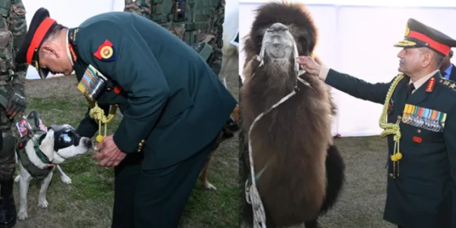 भारतीय सेना प्रमुख उपेंद्र द्विवेदी ने देश की रक्षा में अहम योगदान देने वाले दो बैक्ट्रियन ऊंट, दो जांस्कारी पोनी और दो आर्मी डॉग्स को सम्मानित किया। ये विशेष साथी बर्फीले पहाड़ों से लेकर रेगिस्तानी इलाकों तक चुनौतीपूर्ण अभियानों में सेना का साथ देते हैं।