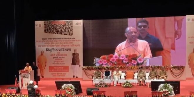 मुख्यमंत्री योगी मंगलवार को गोमती नगर स्थित इंदिरा गांधी प्रतिष्ठान के जुपिटर हाल में उत्तर प्रदेश पुलिस दूरसंचार विभाग के लिए चयनित प्रधान परिचालकों को नियुक्ति पत्र वितरित करने के बाद संबोधित कर रहे थे।