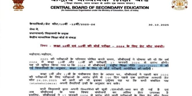 केंद्रीय माध्यमिक शिक्षा बोर्ड की ओर से कक्षा 10वीं और 12वीं बोर्ड परीक्षा की एग्जाम डेट शीट जारी कर दी गई है। जो उम्मीदवार इस साल कक्षा 10वीं या 12वीं की बोर्ड परीक्षा में शामिल होने वाले हैं, वे सीबीएसई की आधिकारिक वेबसाइट www.cbse.gov.in पर जाकर फाइनल डेट शीट डाउनलोड कर सकते हैं। सीबीएसई की आधिकारिक अधिसूचना के मुताबिक कक्षा 10वीं और 12वीं की परीक्षाएं 17 फरवरी, 2026 से प्रारंभ होंगी। इसके साथ ही बोर्ड की ओर से यह भी स्पष्ट किया गया है कि राष्ट्रीय शिक्षा नीति यानी (NEP-2020) के अनुसार कक्षा 10वीं के लिए दो बार बोर्ड परीक्षा आयोजित कराई जाएगी।