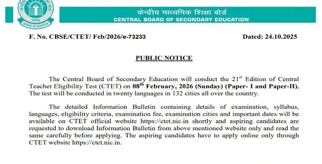 सीबीएसई की आधिकारिक अधिसूचना के मुताबिक CBSE CTET परीक्षा का आयोजन 132 शहरों में 08 फरवरी, 2026 को किया जाएगा। सीबीएसई इस बार अपना 21वां संस्करण (पेपर- I और पेपर- II) आयोजित करेगा। यह परीक्षा कुल 20 भाषाओं में आयोजित कराई जाएगी। इसके साथ ही परीक्षा, पाठ्यक्रम, भाषा, पात्रता मानदंड, परीक्षा शुल्क, परीक्षा शहर और तिथियों की विस्तृत जानकारी जल्द ही वेबसाइट ctet.nic.in पर जारी कर दी जाएगी।