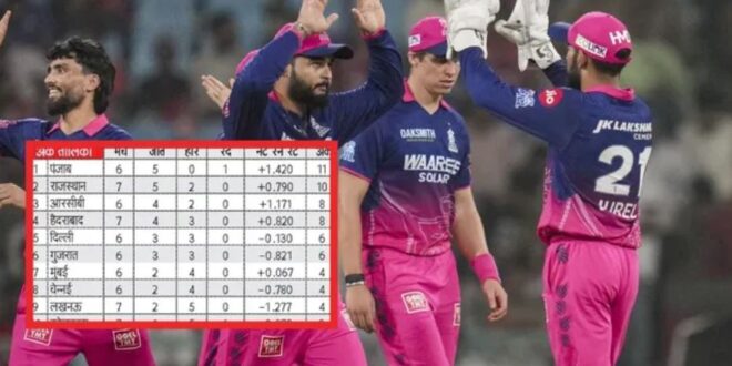 इस मैच में मिली जीत के बाद आरआर की टीम ने अंक तालिका में दूसरे स्थान पर कब्जा कर लिया है। हालांकि, पंजाब किंग्स की टीम पहले स्थान पर 11 अंक के साथ पर मौजूद है। आइए देखते हैं कौन-सी टीम प्वाइंट्स टेबल में सबसे आखिरी पायदान पर है?